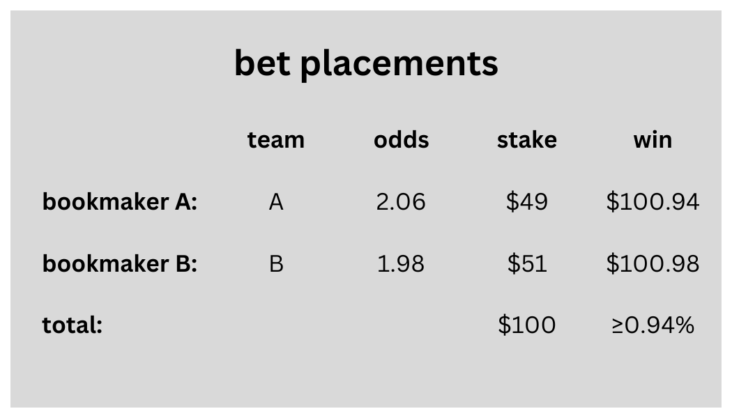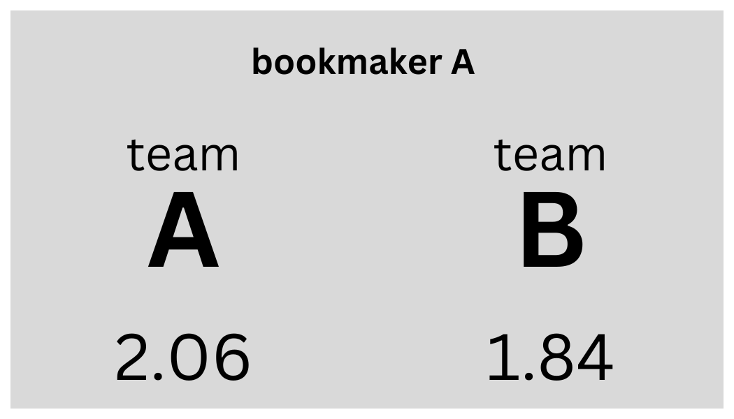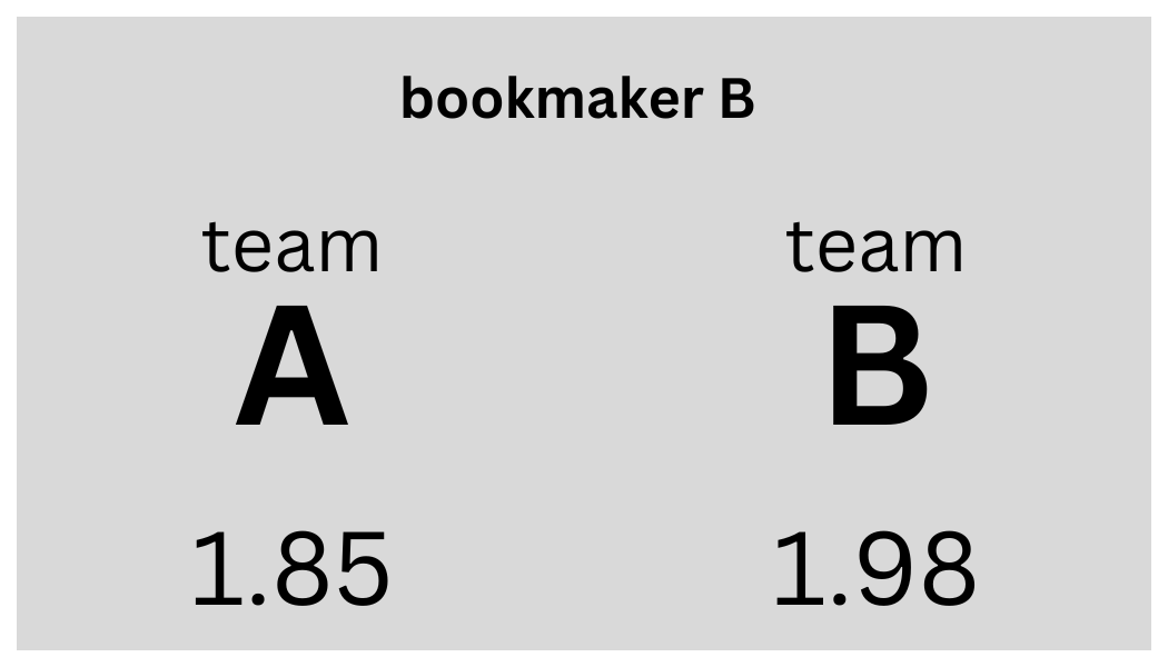 even though bookmakers use advanced prediction systems, no one will ever be able to predict the future with a 100% accuracy. that’s why different prediction models exist, and odds for the same event outcome at different bookmakers can differ. as a bettor, one can make use of that by picking the better odd for each outcome of the event. in the below example, we would bet on team A at bookmaker A (odds: 2.06) and we would bet on team B at bookmakers B (odds: 1.98). if we distribute the amounts correctly, we can walk away with a guaranteed profit of 0.94% to 0.98% with this betting pair.
